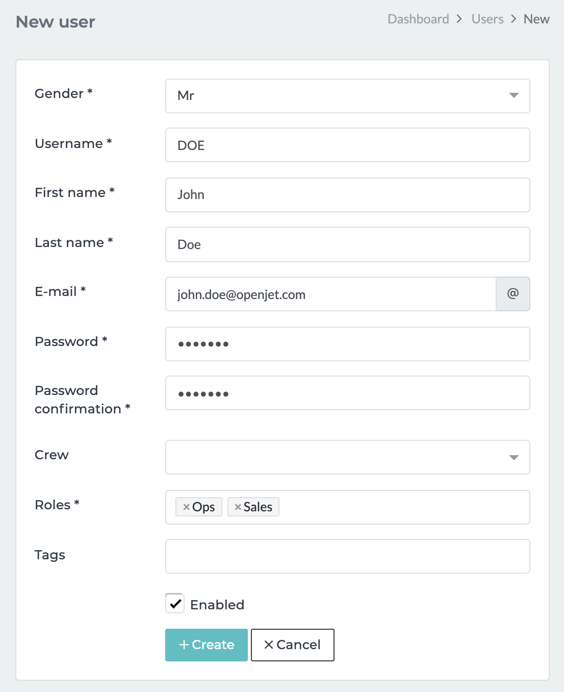Aircrew and users are two separate entities in OpenJet. To link a user to an existing aircrew, make sure that the related aircrew has already been created. You can also create the user first, then create the aircrew and link the two together afterward. For more information about Aircrew, please refer to Manage your crews section.